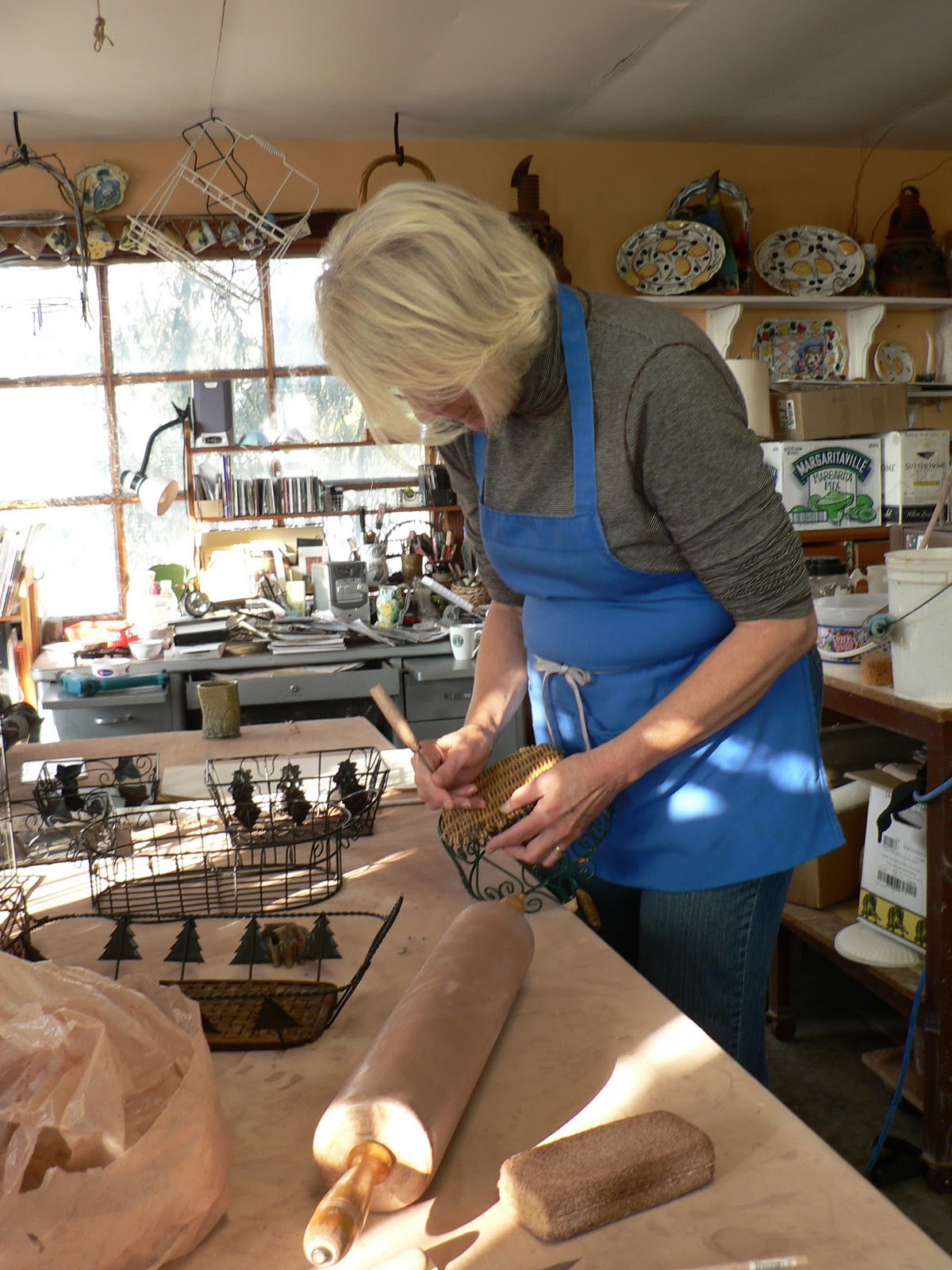 Pat Ligibel, a long-time potter and friend from our days at the Toledo Potters' Guild came over, today, to help me work on some tiles for metal trays. The trays - and baskets - had to be measured out, and then patterns made for the tiles that took into account the shrinkage of the clay. It's a job I've been putting off for a while, but having a friend in the studio working with me is great motivation!